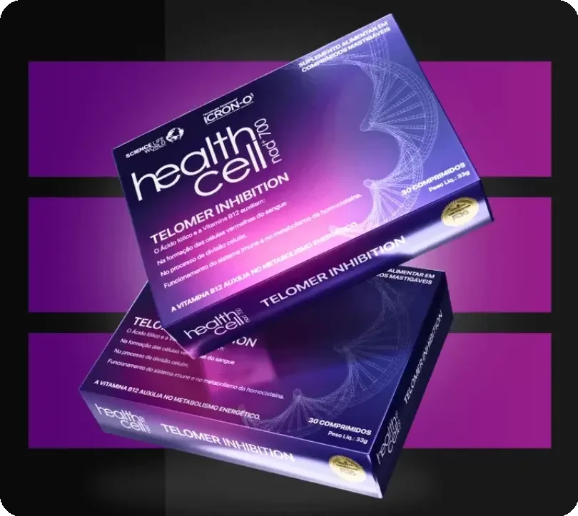 O Health Cell é como uma proteção extra para essas pontas. Ele ativa a telomerase, uma enzima que ajuda a restaurar e prolongar os telômeros, impedindo que o ‘cadarço’ do DNA se desgaste tão rapidamente.